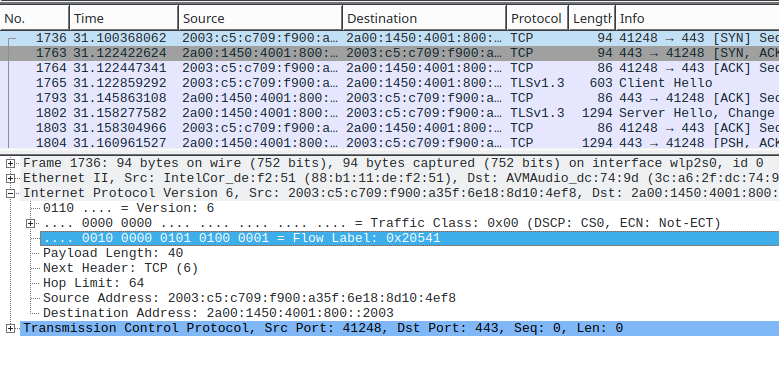 Grund für diesen Toot ist, dass mir nicht klar war, wer die Flow-Label bei IPv6 generiert. Beschreibungen über das Flowlabel im Internet sind eher mager. Ein Blick in WIreshark hat dann das Rätsel gelöst :-)